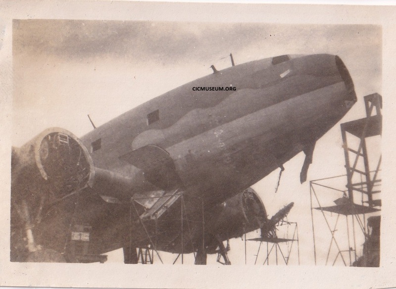 This is a photo of a Curtiss C-46 Commando transport aircraft on Missamari (FKA Misamari) airfield in Assam. The aircraft carried drums of gasoline to China and then brought tungsten back as ballast. If for some reason there was no tungsten on the return and the pilot braked too hard the aircraft could "nose over" flipping forward onto the nose and also the front of the engines. This photo shows an aircraft clearly undergoing repairs following a nose over. This was one of the many airfields used for flying "the hump" into China from India in the CBI theater.